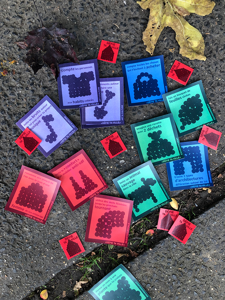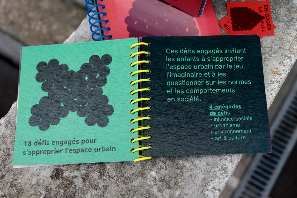 « Défie ta ville » consiste en un jeu de 18 défis engagés qui invitent les enfants à s’approprier l’espace urbain par l’exploration et l’imaginaire. 4 catégories de défis les questionnent sur les normes et les comportements en société : injustice sociale, urbanisme, environnement, art & culture. En lien avec les recherches de Thierry Paquot sur la place accordée aux enfant dans l’aménagement de l’espace urbain, « Défie ta ville » vise à rendre la ville plus hospitalière pour les enfants.