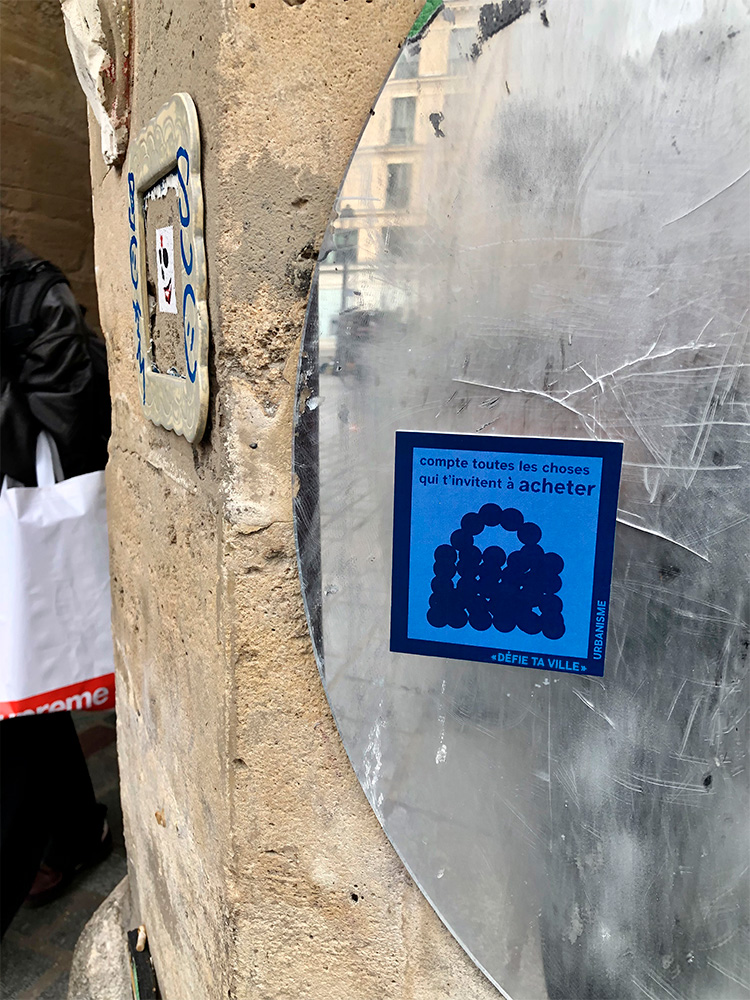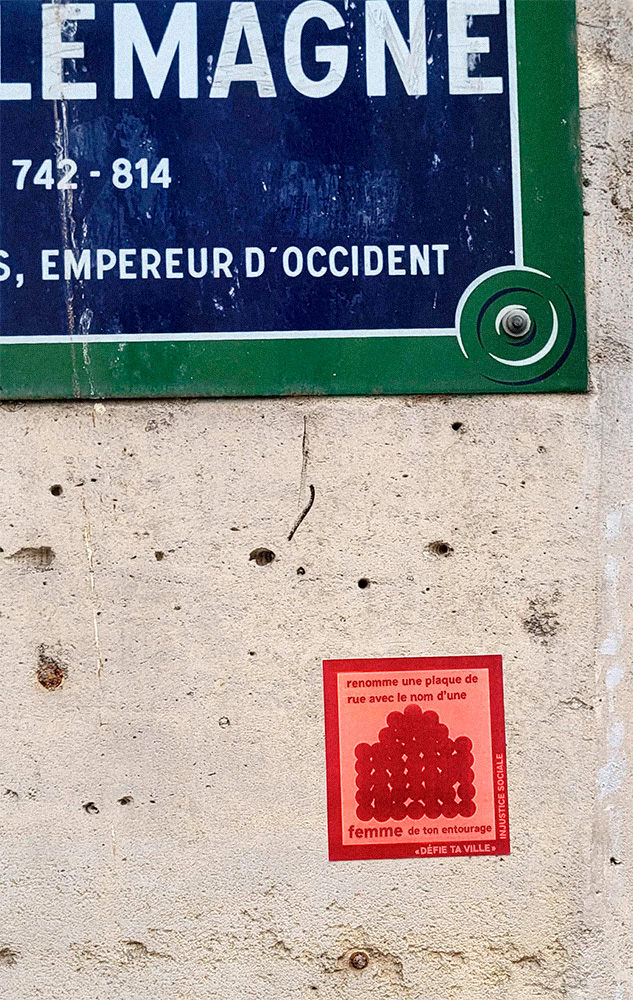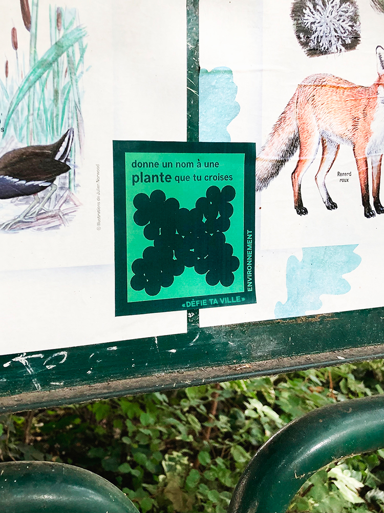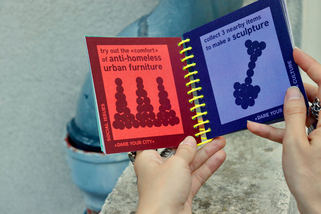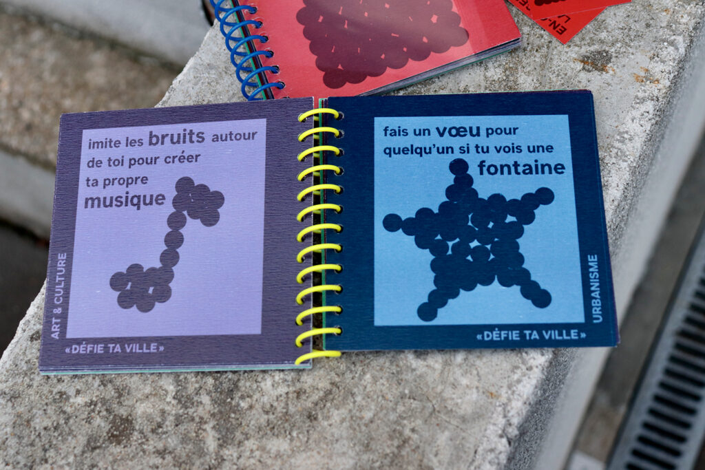 Certains défis sont à trouver dans la ville tandis qu’un livre de poche à emmener en promenade avec soi rassemble tous les défis. C’est un livre qui se lit dans les deux sens, traduit en français et en anglais.